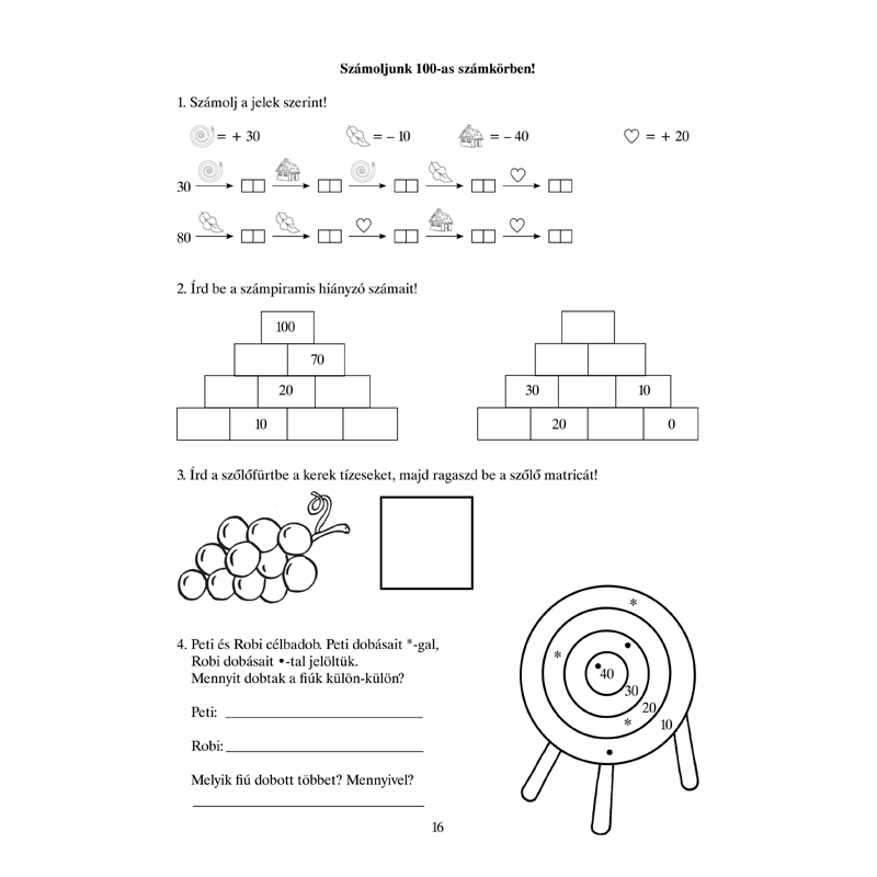 Kedves 2.osztályos barátom! Biztos felkészültél a következő dolgozatra? Gyakoroltál eleget a nagy megmérettetésre? Hibátlan dolgozatot szeretnél írni az iskolában? Ez a munkafüzet segít neked abban, hogy jó jegyek kerüljenek a bizonyítványodba! A 2. osztályos matematika sok újdonságot hoz az eddigi tudományodba. Találkozni fogsz az 100-as számkör „lakóival” és a műveleteket már írásban fogod végezni. A munkafüzet feladataival átismételheted az óvodában tanultakat. Ha már úgy érzed, garantált a siker, próbáld ki a tudásod a témakörök végén található szintfelmérőkkel. Játékos feladatokkal öröm a matematika tanulása. A színes matricák még vidámabbá teszik a tanulást! Legyél nagyon figyelmes, gondolkozz logikusan! Kalandra fel! Jó munkát! Mindent bele!